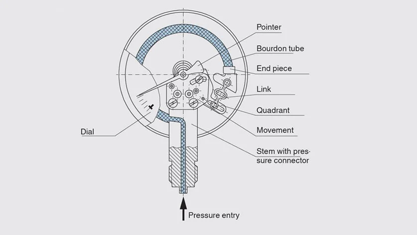 Mechanism: The working mechanism depends on the gauge type, but the most common is the Bourdon tube pressure gauge: